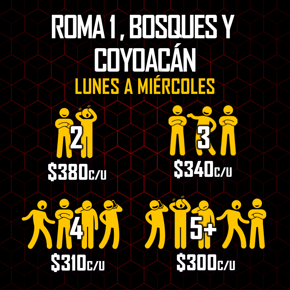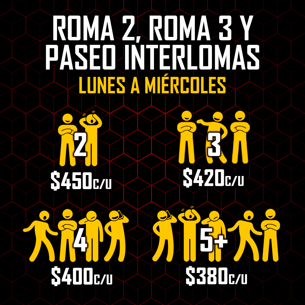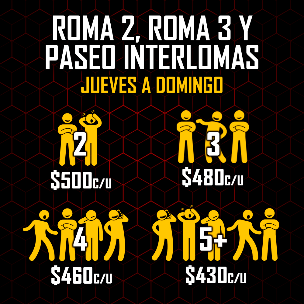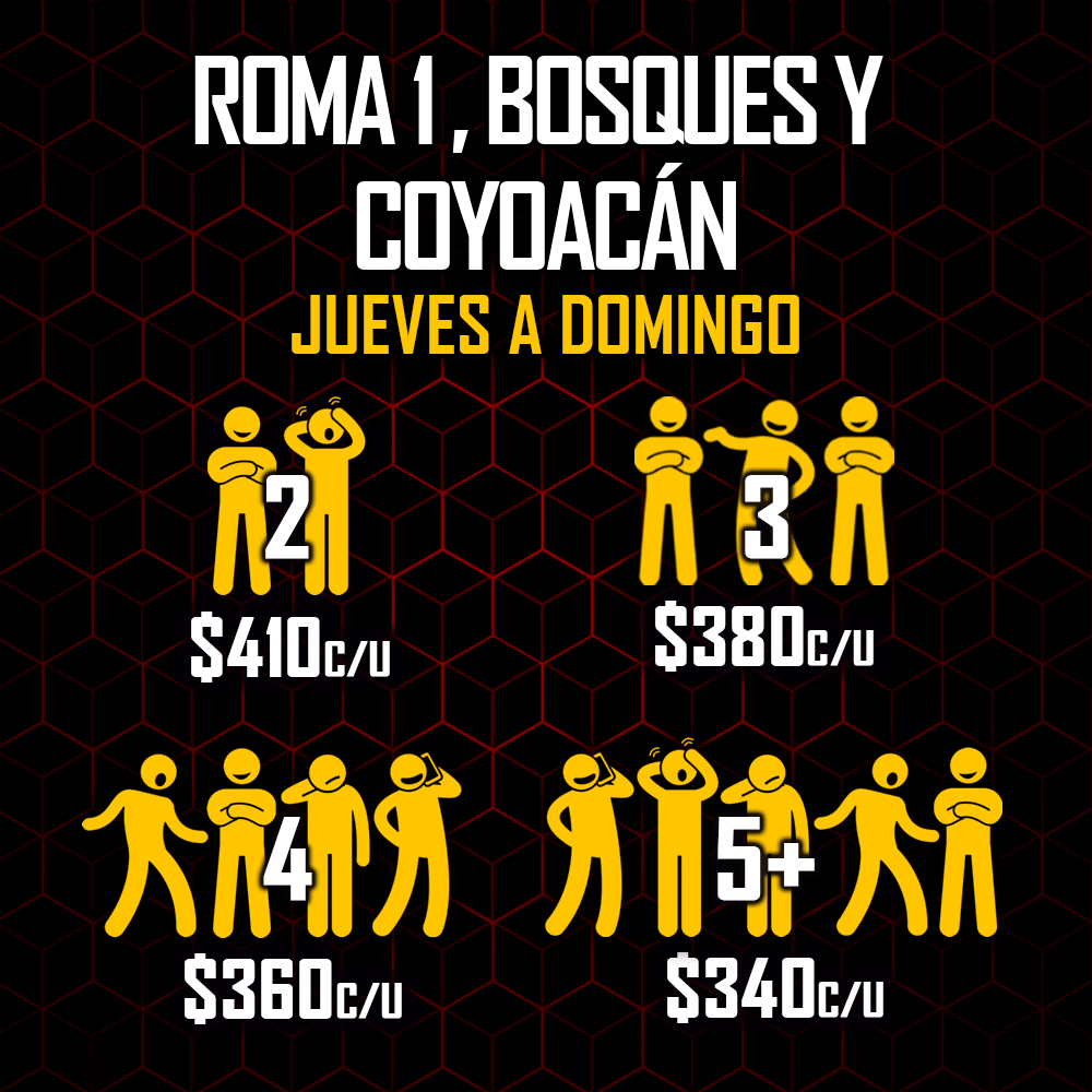 Los precios señalados son en MXN e incluyen 60 minutos máximo de juego en el Enigma Room® de tu elección. Todos los precios son más IVA, en caso de requerir factura. La factura se debe solicitar el día del evento, siendo únicamente facturable en el mes en el que se genera el ticket de venta.