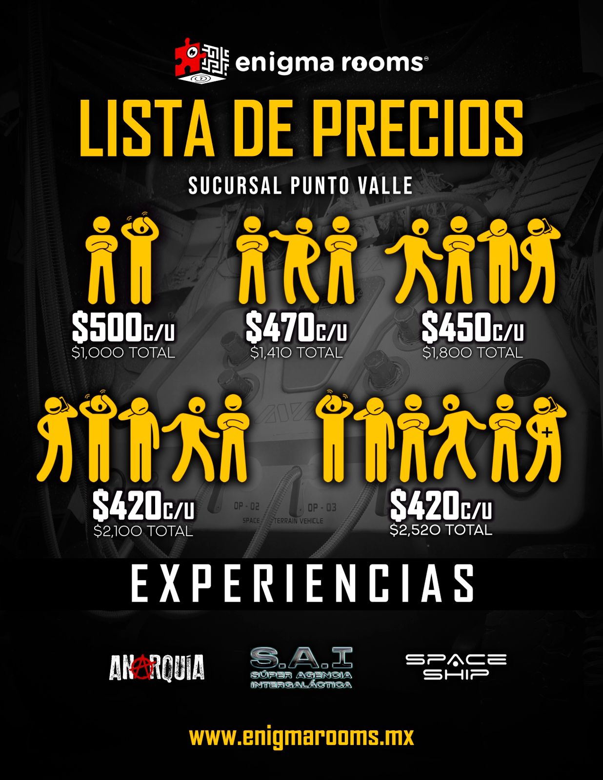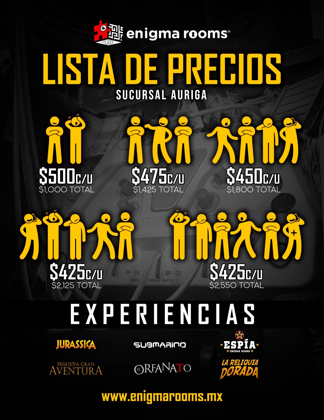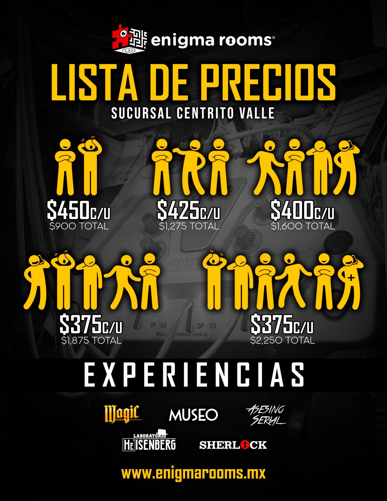 Los precios señalados son en MXN e incluyen 60 minutos máximo de juego en el Enigma Room® de tu elección. Todos los precios son más IVA, en caso de requerir factura. La factura se debe solicitar el día del evento, siendo únicamente facturable en el mes en el que se genera el ticket de venta.